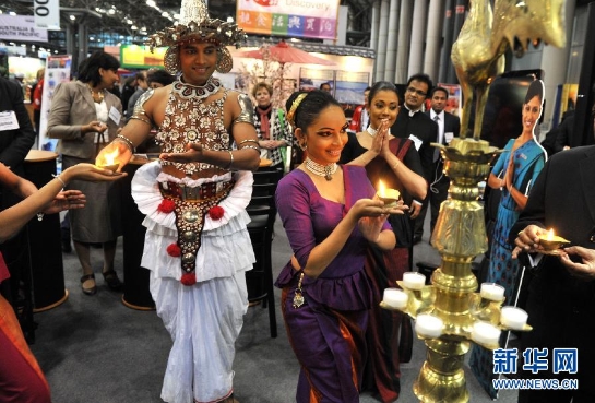 3月2日,來自斯里蘭卡的演員在美國紐約國際旅游展上用歌舞推介本國旅游。當天,紐約國際旅游展在紐約市曼哈頓正式開展。一年一度的紐約國際旅游展每年吸引數萬名國內外游客和業內人員前往,在美國經濟面臨復蘇的前景下格外受到關注。(來源:新華網)