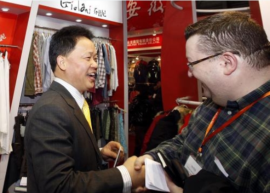 安徽一家服裝民營企業的負責人(左)與來自英國的客商達成訂貨意向后熱情握手(3月1日攝)。3月5日,為期5天的第22屆中國華東進出口商品交易閉幕。本屆華交會出口總成交31.22億美元,比上屆增長9.98%。本屆華交會民營企業成交達17.53億美元,同比增長34.06%,占成交總額的56.13%。