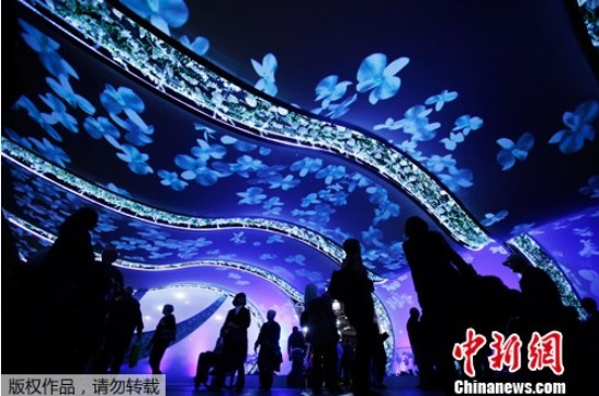 2012年3月5日,美國賓夕法尼亞州費城會展中心舉行的2012年費城國際花,游客在觀看瓦利福奇鮮花公司(Valley Forge Flowers)推出的視頻投影《波浪》(Wave)。