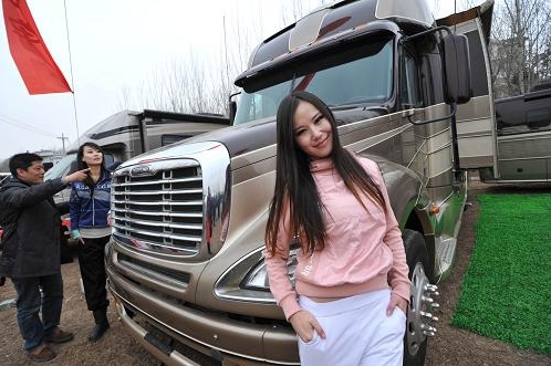 3月22日,一名車模站在第四屆北京國際房車露營展一款大型房車前。當日,為期4天的2012第四屆北京國際房車露營展覽會在北京市房山區北京房車博覽中心開幕。近200輛房車,近千種各類型房車零配件等與公眾見面。