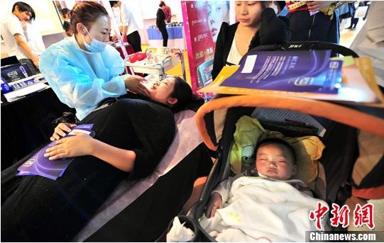 4月17日,一位“愛美媽媽”在展會上接受免費美容服務,她帶著的孩子在一旁的嬰兒車內呼呼大睡。當日,“2012北京國際美容美發化妝用品博覽會”在中國國際展覽中心開幕,眾多女士前來參加活動,排隊等待享受免費美容化妝的服務。(來源:中新網)