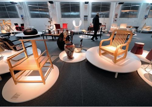 4月18日,“坐下來”——中國當代坐具設計展應邀亮相意大利米蘭設計周,觀眾在現場參觀。本次展覽邀請50多位中國設計師,以“椅子”為題材,設計了80多件融合傳統與當代元素、哲思與功能并重的作品。