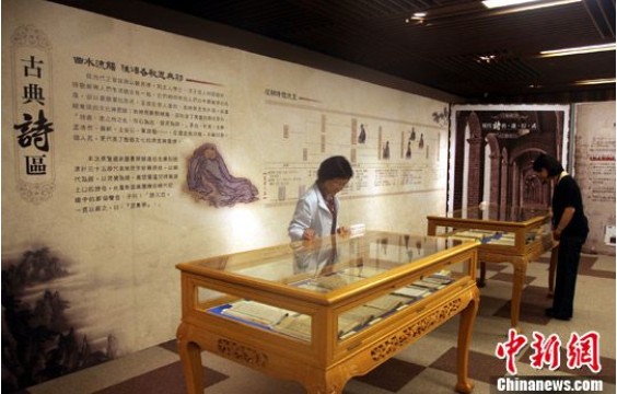 5月6日,臺灣圖書館舉辦尋找春天的詩蹤展覽。展出包括館藏珍貴中國古詩線裝書在內的展品。圖為民眾在觀看古詩線裝書展柜。(來源:中新網)