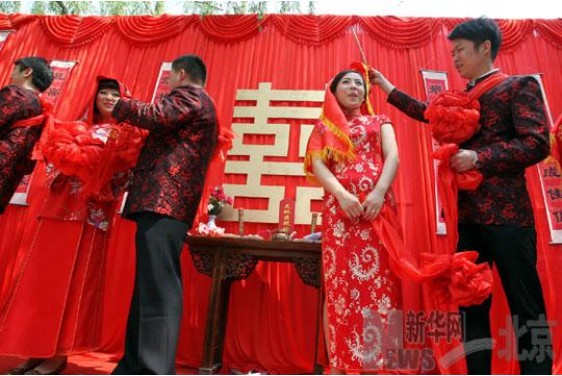 5月8日,一場按照北京民俗舉辦的中式集體婚禮在北海公園舉行,六對新人喜結良緣。此次婚禮揭開了2012西城時尚婚慶文化博覽會的“蓋頭”。作為2012北京西單國際時尚節系列主題活動之一,2012北京西城時尚婚慶文化博覽會于5月8日--13日在北海公園舉辦。(來源:新華網)