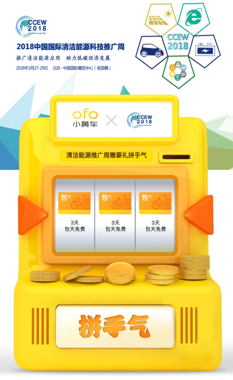 熟悉小黃車的用戶都知道,月卡和騎行券一直是ofo的固定福利模式,而全新上線的手氣卡,則將ofo的福利資源進(jìn)行了全面整合。手氣卡是一個(gè)包含月卡、周卡、騎行券、折扣券等多重優(yōu)惠福利的大禮包,用戶通過老虎機(jī)搖獎(jiǎng)即可隨機(jī)獲得不同種類的優(yōu)惠獎(jiǎng)品。參與2018中國國際清潔能源科技推廣周與ofo小黃車聯(lián)名手氣卡的方式非常簡單,活動期內(nèi),用戶可通過推廣周官方微博、微信、EDM等平臺找到活動消息: