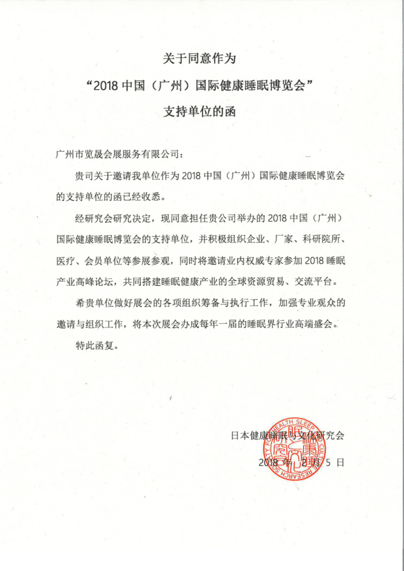日本健康睡眠與文化研究會(huì)關(guān)于同意作為廣州睡博會(huì)支持單位的函