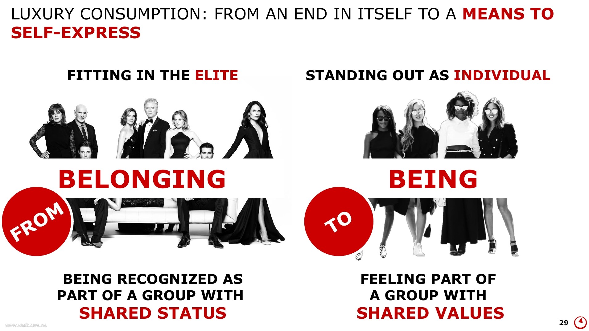 不同于上幾代購買者的炫耀性消費,伴隨互聯網和數字化的發展,千禧一代天然對奢侈品的認知度高,有自己對品牌的理解和對時尚的看法。“時尚”、“新潮”、“個性化”、“當季“是對奢侈品應被賦予全新定義。諸多奢侈品牌為適宜消費人群的轉變,對自身品牌進行重新定位。奢侈品市場逐漸也向多元化、多樣化、個性化的方向發展。