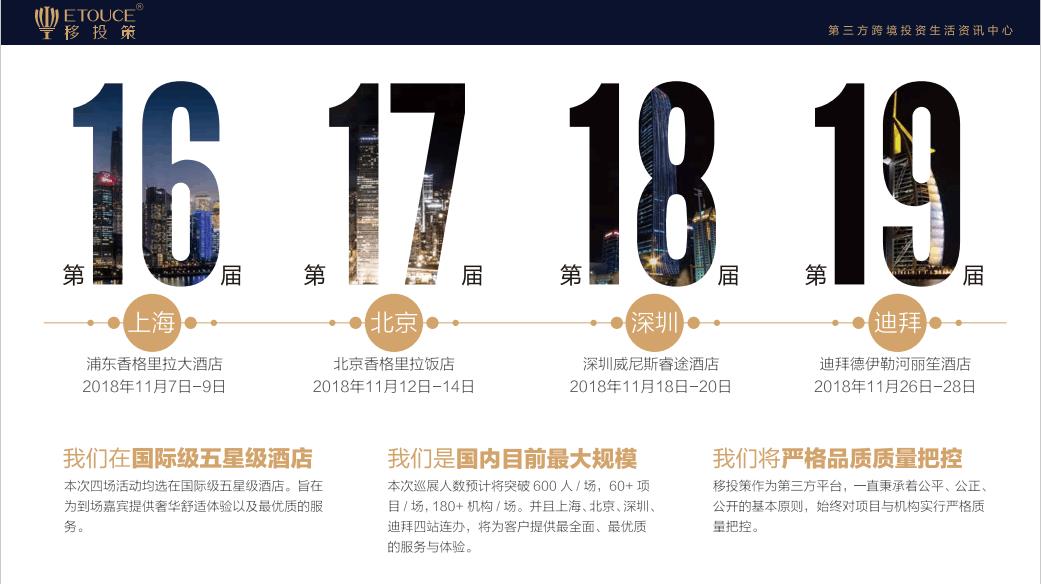 2018年11月,移投策|移投行業精英交流盛會巡回展,相約北京、上海、深圳、迪拜四地,提前預訂展位更享鉅惠。