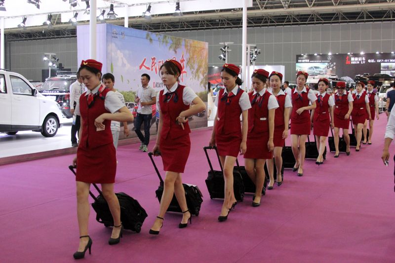 裝扮成空姐的小姐姐們提著手提箱,是國博一條靚麗的風(fēng)景線