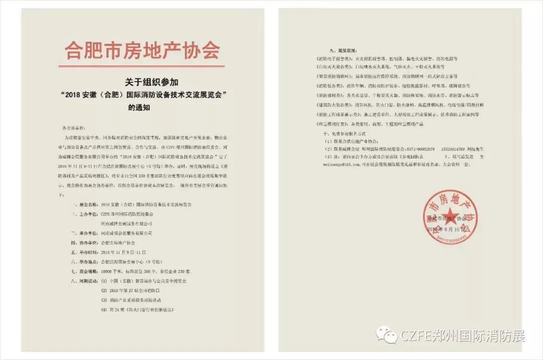 由威博會展|CZFE鄭州國際消防展組委會舉辦的“2018安徽(合肥)國際消防設備技術交流展覽會”將于2018年11月9日-11日在合肥濱湖國際會展中心(5號館)召開,合肥市房地產(chǎn)協(xié)會作為協(xié)辦單位之一直接參與消防展籌備,并下達舉辦安徽(合肥)國際消防展《通知文件》。
