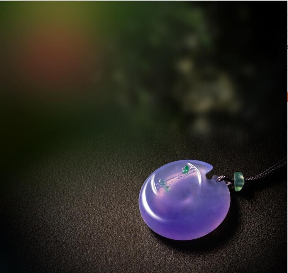 紫羅蘭翡翠平安扣左上方有綠色點綴,俏色雕刻,營造出一種靜謐的境界。紫與綠相伴相隨,任時光荏苒,不離不棄。從作品中感受生活、記憶、片段……透過這件作品想到人生中的點點滴滴。