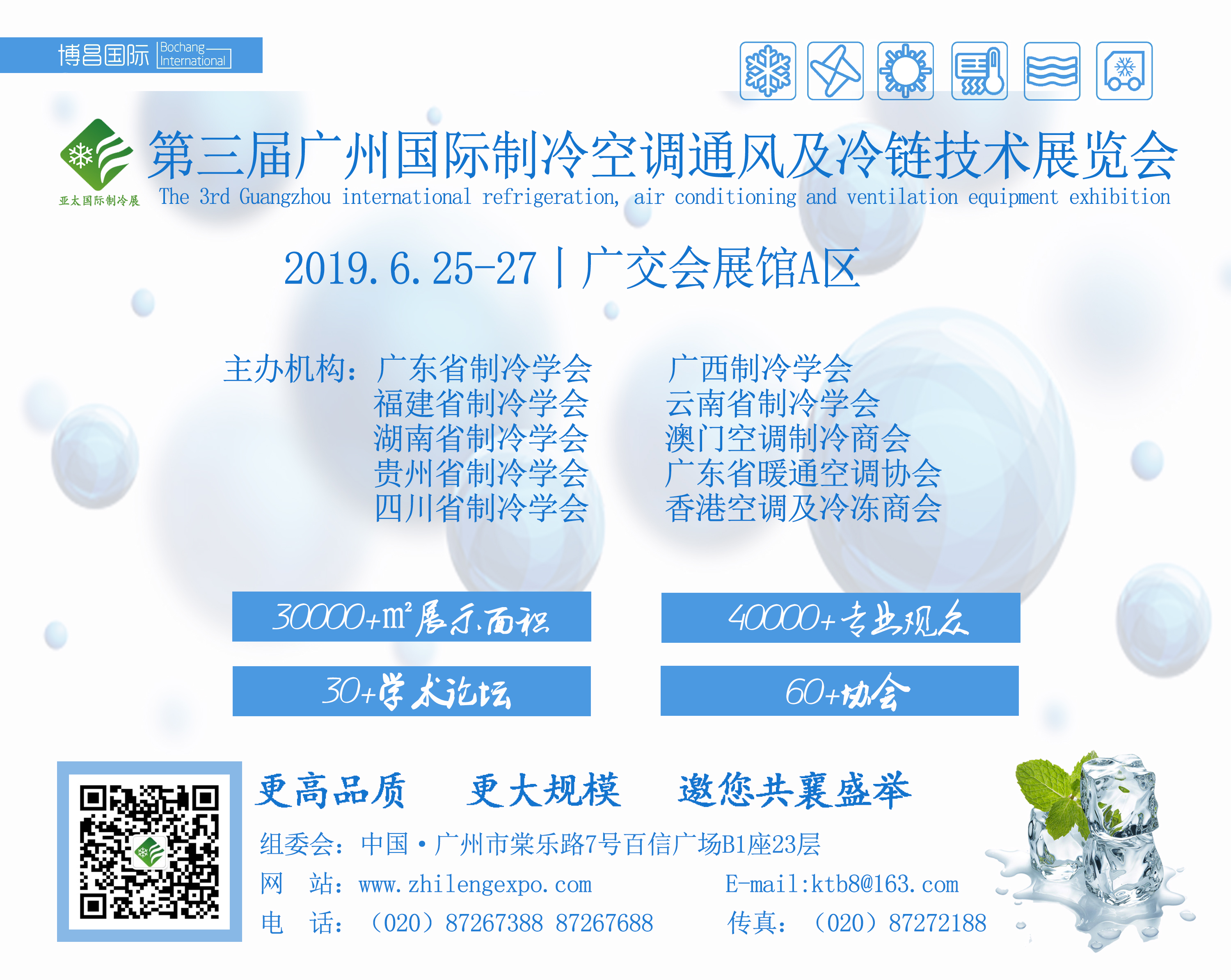 2019第三屆中國廣州國際制冷空調(diào)通風(fēng)及冷鏈技術(shù)展覽會﹝簡稱:亞太(廣州)國際制冷展﹞將于2019年6月25-27日在廣交會展館A區(qū)舉行,以“對接粵港澳大灣區(qū) 鏈接全球制冷市場”為主題,依托全球最大的制造基地和市場優(yōu)勢,預(yù)計展位面積30000平方米,來自世界30多個國家和地區(qū)的近500家企業(yè)參展,專業(yè)觀眾可達(dá)4萬余人,同期舉行2019“一帶一路”制冷空調(diào)產(chǎn)業(yè)創(chuàng)新創(chuàng)業(yè)大會等30多場高峰論壇,一次集產(chǎn)、學(xué)、研、用一站式高效交流的國際性行業(yè)盛會。