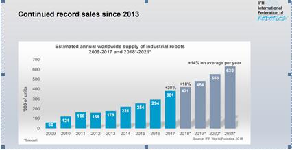 今年10月,國際機(jī)器人聯(lián)盟(IFR)在日本東京舉行的“World Robot Summit 2018”記者招待會(huì)上公布了每年都會(huì)發(fā)行的“The World Robotics Report”,根據(jù)報(bào)告顯示,全球工業(yè)用機(jī)器人領(lǐng)域投資將持續(xù)增加。從2013年到2017年,全世界工業(yè)用機(jī)器人的銷量增加了2倍,2018至2021年,年平均增長率為14%。汽車、電子、金屬工業(yè)等領(lǐng)域機(jī)器人自動(dòng)化的需求持續(xù)增加,不論大企業(yè)還是中小型企業(yè)均對(duì)自動(dòng)化表現(xiàn)出極大的興趣,愿意嘗試借勢(shì)機(jī)器人轉(zhuǎn)型,讓企業(yè)搭上智能制造快車。