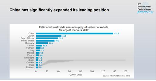 2017年,占據(jù)全球機(jī)器人市場份額73%的5個(gè)國家依次是中國、日本、韓國、美國、德國。其中,中國工業(yè)機(jī)器人的銷量達(dá)到137.9萬臺(tái),占據(jù)了世界供應(yīng)量的36%,進(jìn)一步鞏固了第一大市場的位置。2013年至2017年,中國已連續(xù)五年成為全球最大的工業(yè)機(jī)器人應(yīng)用市場。據(jù)預(yù)計(jì),到2020年我國機(jī)器人市場規(guī)模將進(jìn)一步擴(kuò)大到2000億元,工業(yè)機(jī)器人發(fā)展一片“火熱”景象。