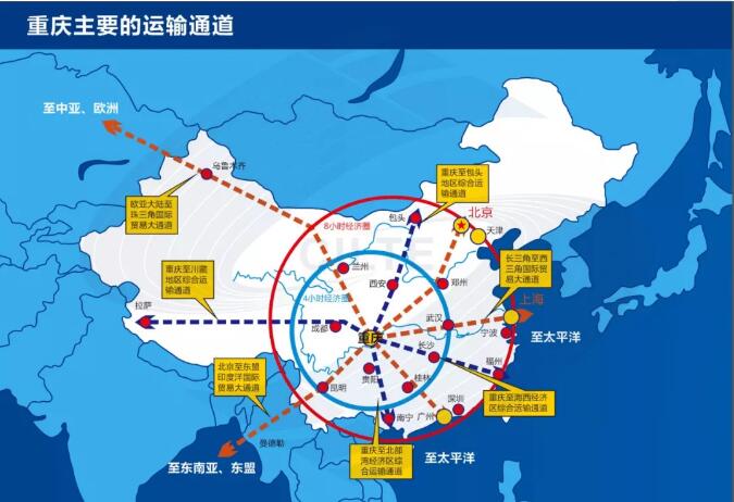 重慶是西部大開發的重要戰略支點,是“一帶一路”和長江經濟帶的聯結點。重慶向東有長江黃金水道、向西有中歐班列(重慶)、向南有“國際陸海貿易新通道”、向北有“渝滿俄”班列,立足內陸、面向國際;