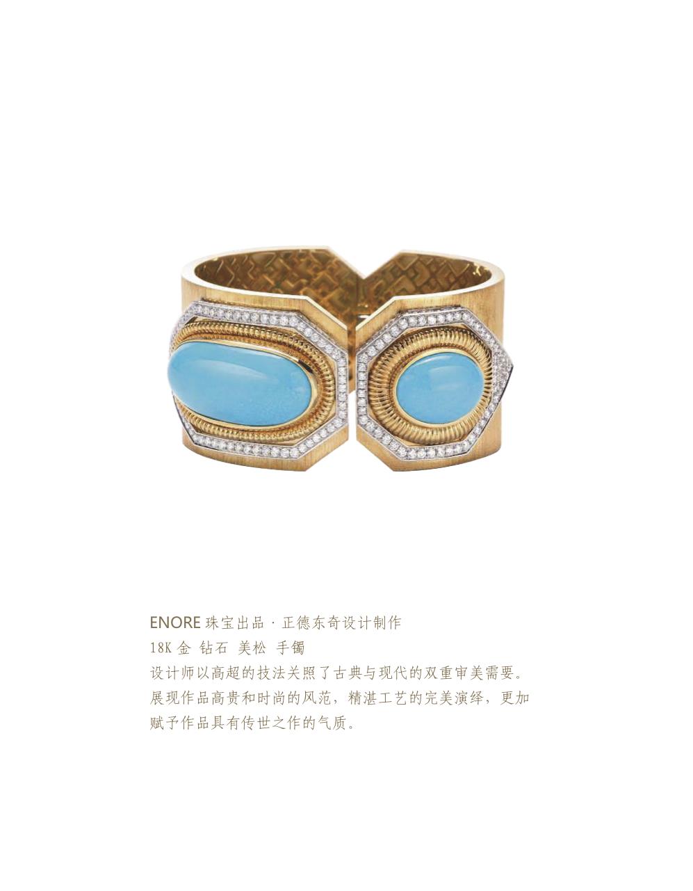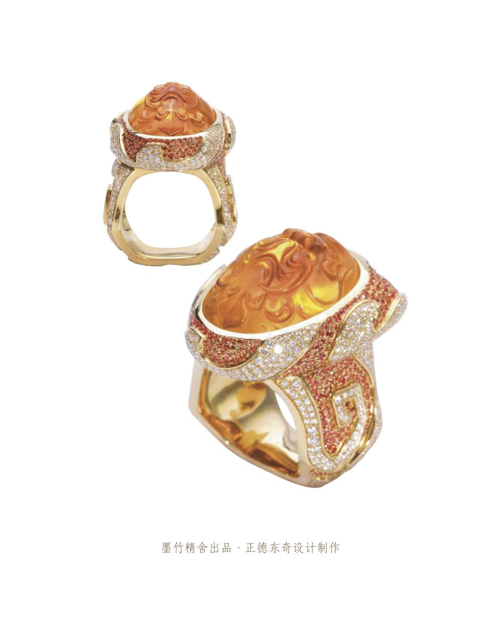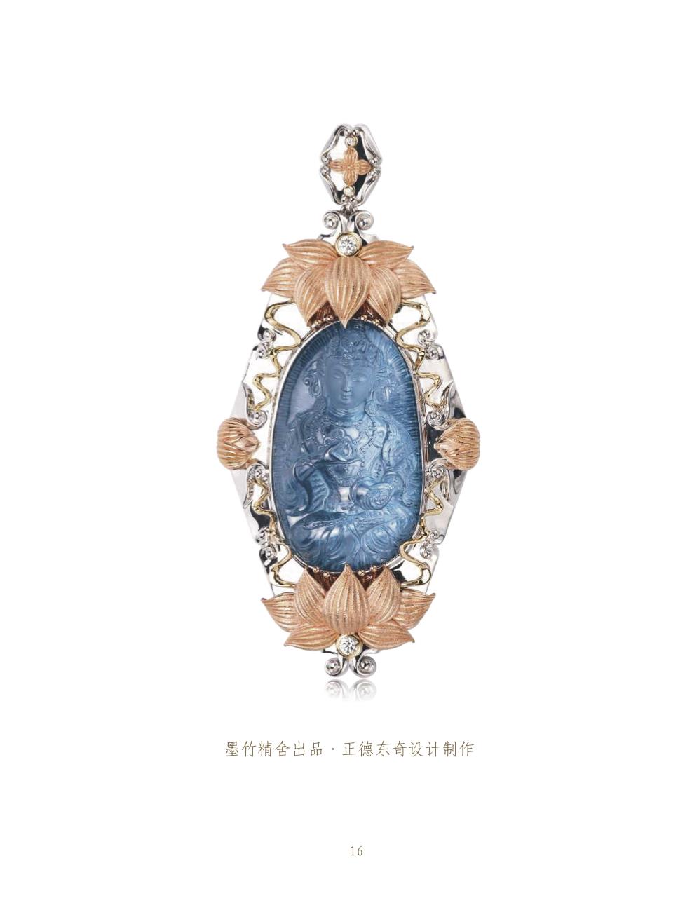 設(shè)計師以粗獷有力的金屬線條和明亮溫暖的配石色彩,恰到好處的迎合了大師雕刻作品。整件作品完美演繹出雕刻作品與金工鑲嵌的和諧融洽。配以繁復(fù)華麗的鑲嵌工藝。獲得第十屆中國上海玉石雕刻“玉龍獎”銀獎。