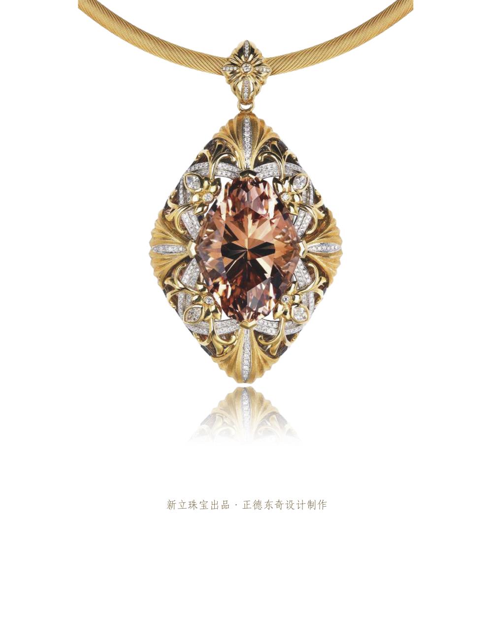 18K金-鉆石-摩根石,整件首飾以一顆高品質(zhì),特殊切割的摩根石為中心、承襲華貴復(fù)古的設(shè)計風(fēng)格,配以繁復(fù)的金工鑲嵌。