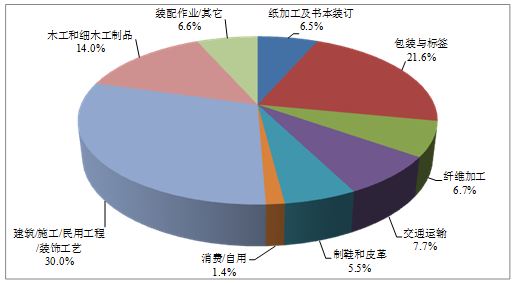 膠粘劑應用市場增長最快的應用領域是建筑/施工/民用工程/裝飾工藝,占總應用市場的30%,而包裝與標簽用膠占21.6%,木工和細木工制品用膠占14.0%,交通運輸用膠占7.7%。纖維加工、裝配作業、紙加工及書本裝訂、制鞋和皮革這四個領域,分別占5.5?6.7%之間。