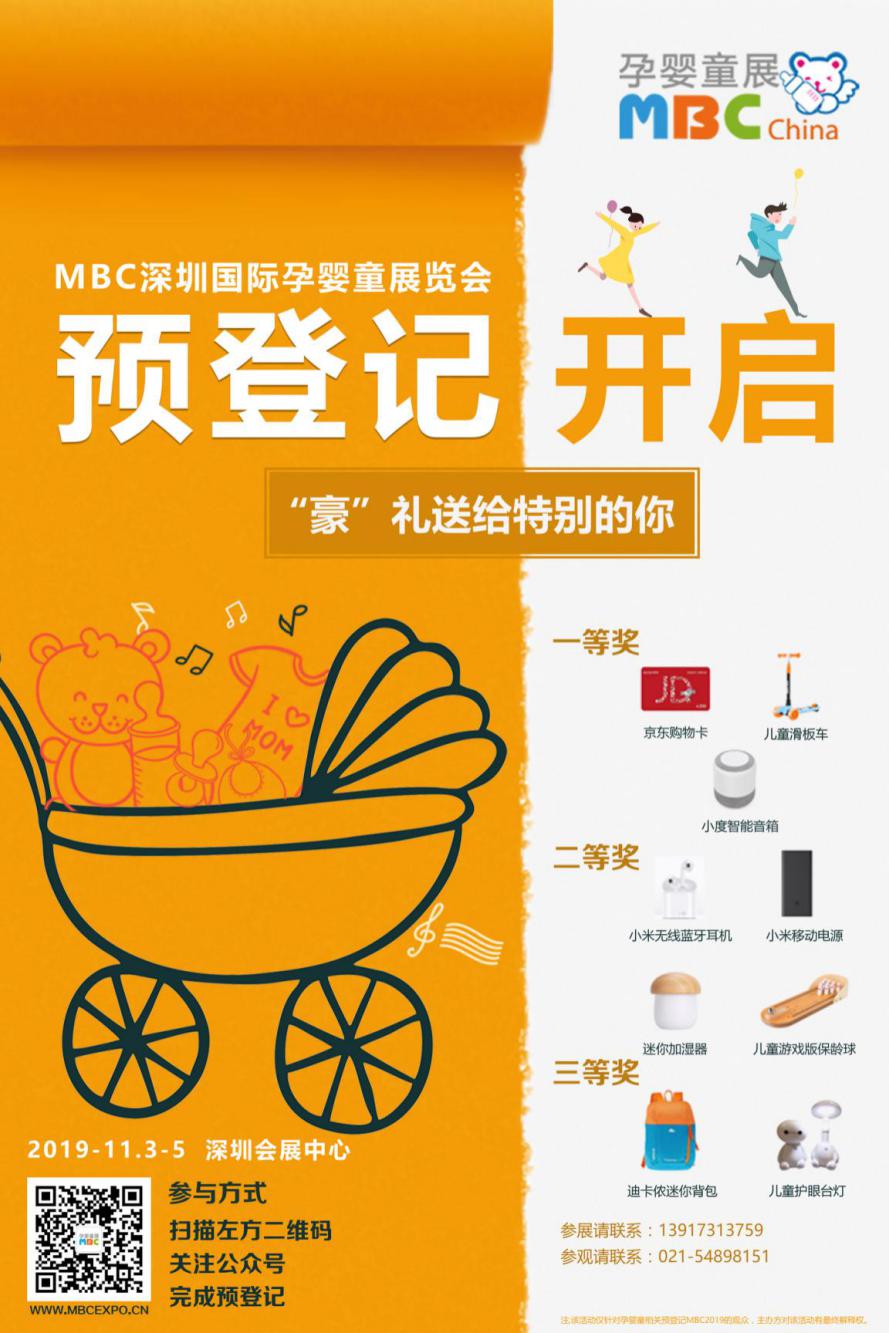 今日,告訴大家一個好消息:2019 深圳國際孕嬰童用品展覽會(簡稱:MBC深圳孕嬰童展)線上預登記抽獎活動提前開始啦!在原有的一月一次抽獎的基礎上,再增加一次抽獎活動,也就是說本月的18號,將進行抽獎活動。