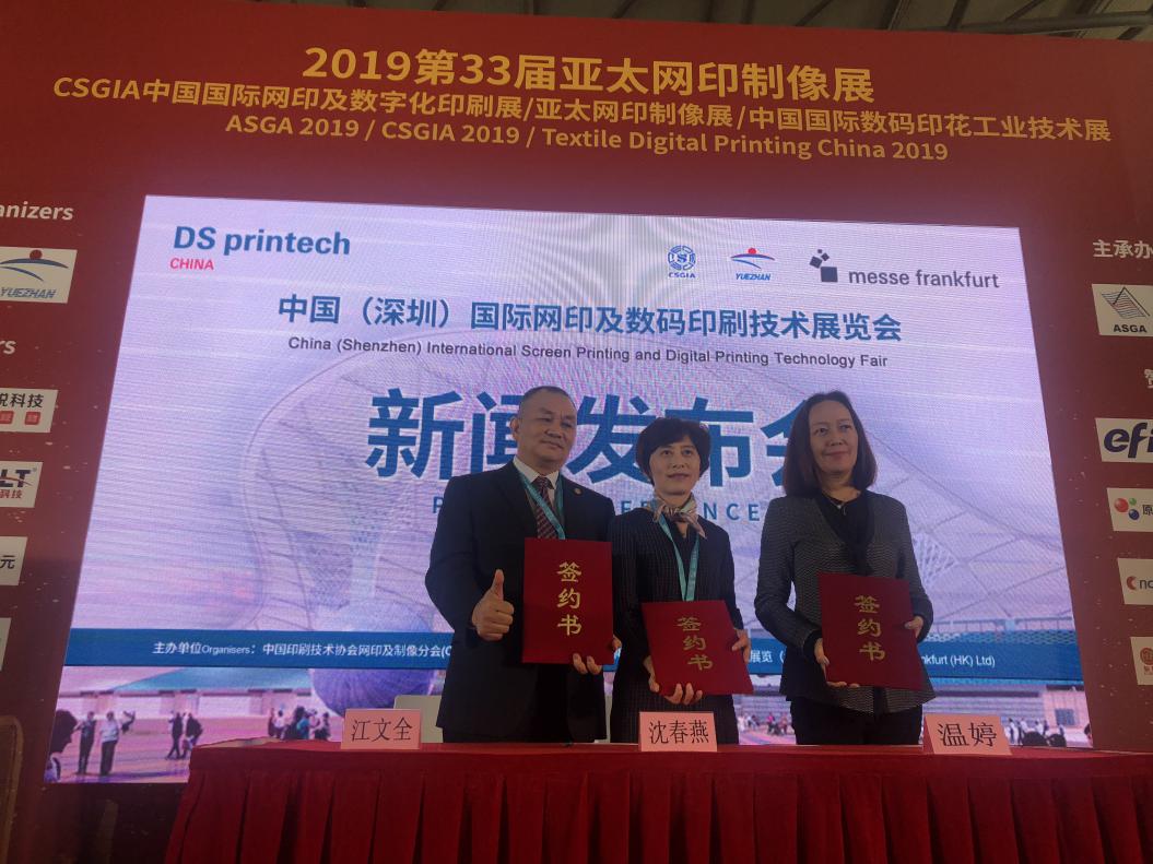 法蘭克福展覽(香港)有限公司、中國印刷技術協會網印及制像分會(CSGIA)及廣州市特印展覽服務有限公司(特印展覽)在今天(10月30日)于上海的合作協議簽訂儀式中宣布合作舉辦中國(深圳)國際網印及數碼印刷技術展覽會(下稱:DS Printech China)。DS Printech China是由CSGIA及特印展覽所擁有超過30年歷史的展會——中國國際網印及數字化印刷展及同期展會中國國際數碼印花工業技術展優化整合而成,并將于2020年10月從廣州移師深圳國際會展中心舉行。