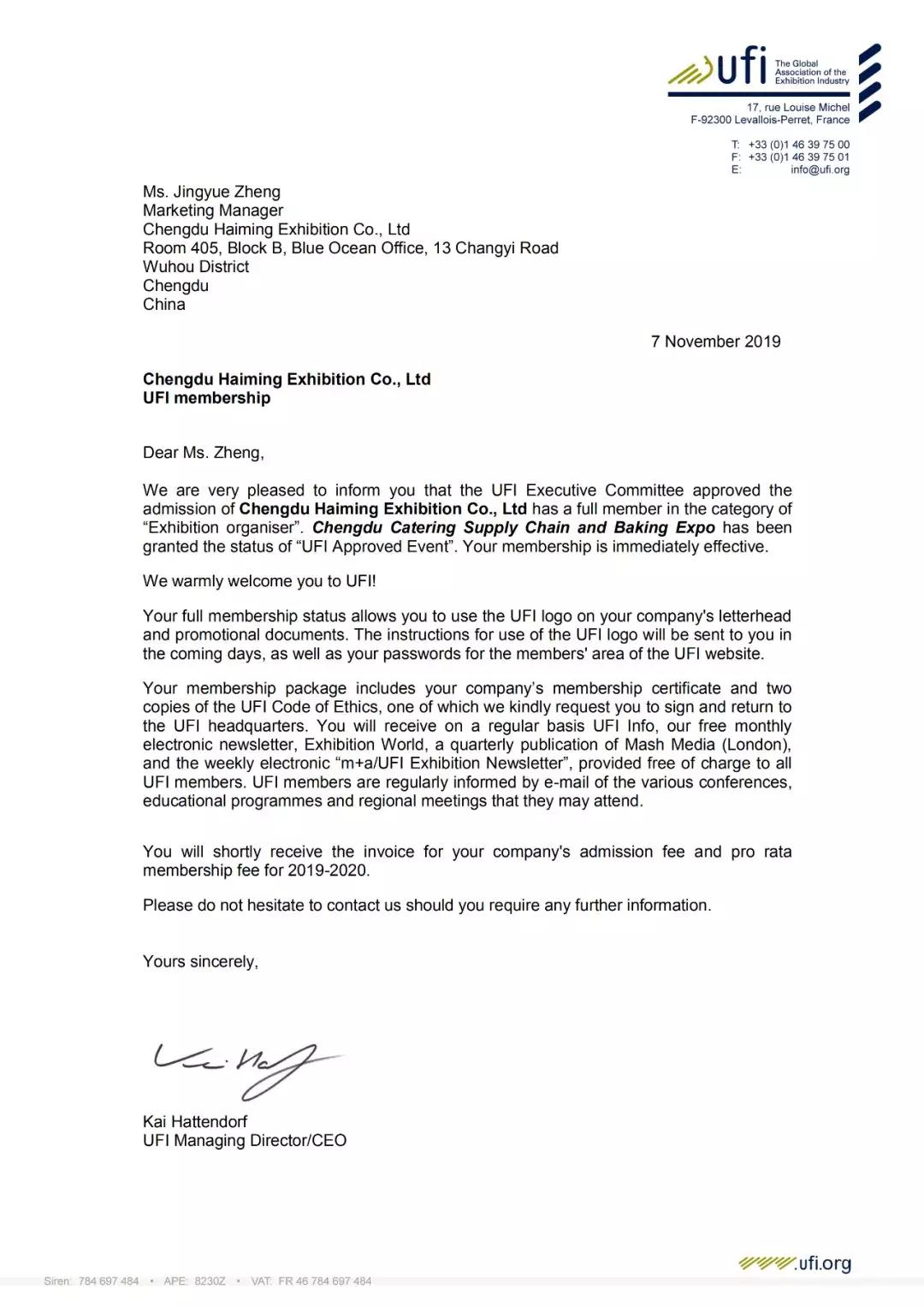 2019年11月7日,UFI(國際展覽業協會)巴黎總部傳來喜訊:海名成都餐飲供應鏈及烘焙博覽會正式通過UFI認證,展會主辦方成都海名會展有限公司通過UFI評審委員會的表決,正式成為UFI會員單位。