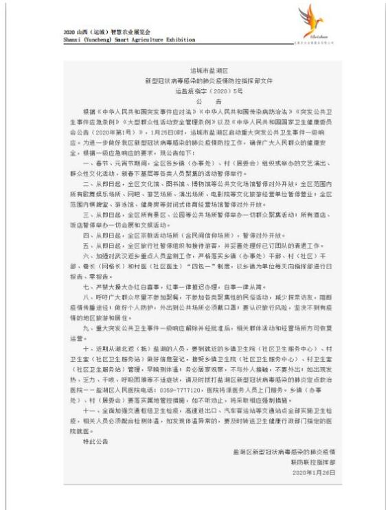 自新型冠狀病毒感染肺炎疫情發生以來,舉國上下高度重視,全民全力防控。為響應及配合山西省新型冠狀病毒感染的肺炎疫情防控領導小組辦公室的安排部署,貫徹運城市鹽湖區新型冠狀病毒感染的肺炎疫情聯防聯控指揮部防控工作的要求,確保各參展商及觀眾的身體健康和生命安全,原定于2020年2月26-27日在運城市農業展覽中心召開的山西(運城)智慧展覽會將延期舉行。