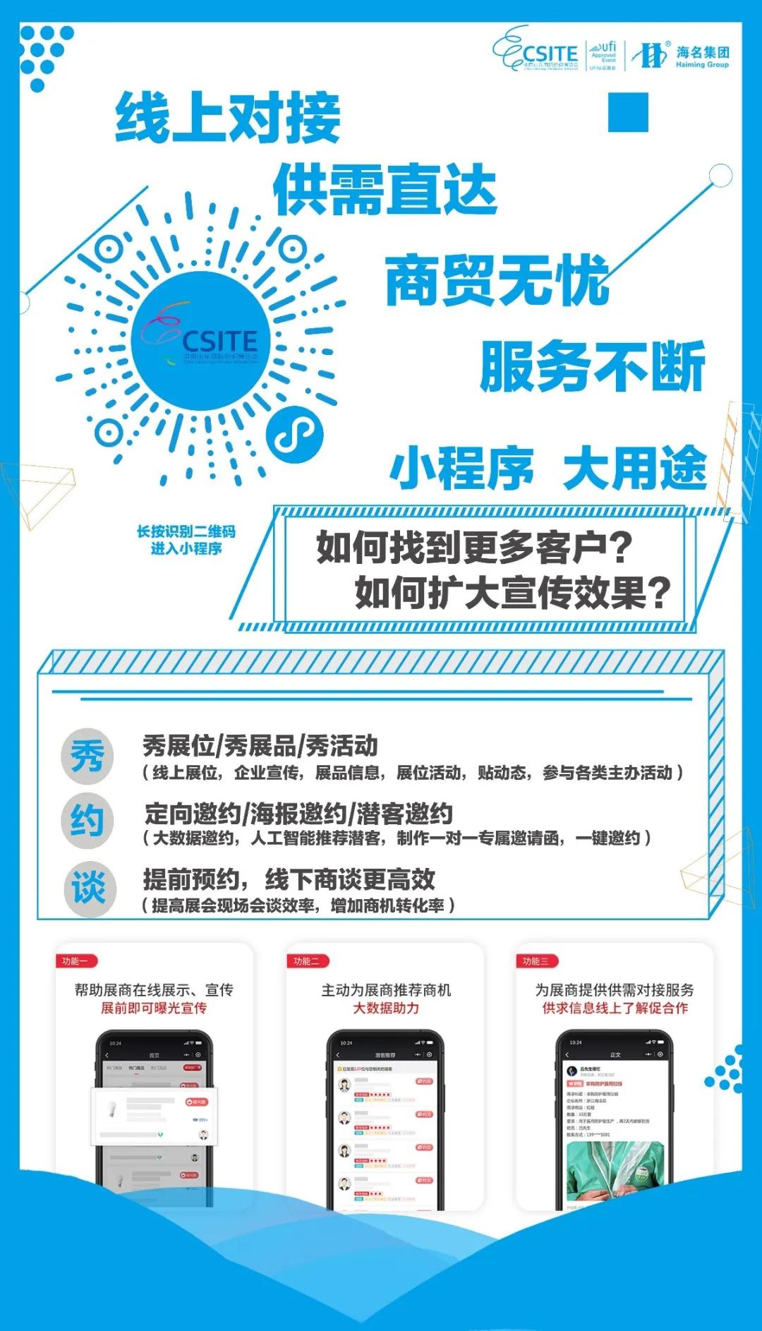 海名線上會展部將為展商提供365天不間斷服務(wù),實現(xiàn)線上供需匹配,商貿(mào)無憂!同時,逐步開展圍繞展商和專業(yè)觀眾的線上云展示、云對接,包括B2B品類細(xì)化直播、訂單一鍵匹配,以及長線布局垂直行業(yè)會展關(guān)聯(lián)的B2B線上云平臺等。海名國際會展集團(tuán)將在數(shù)字化轉(zhuǎn)型道路上,不斷疊加網(wǎng)絡(luò)化、科技化的新展覽服務(wù),推動“會展+”服務(wù)新模式,實現(xiàn)線上線下展覽同開,千人千面的個性化服務(wù)。