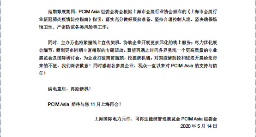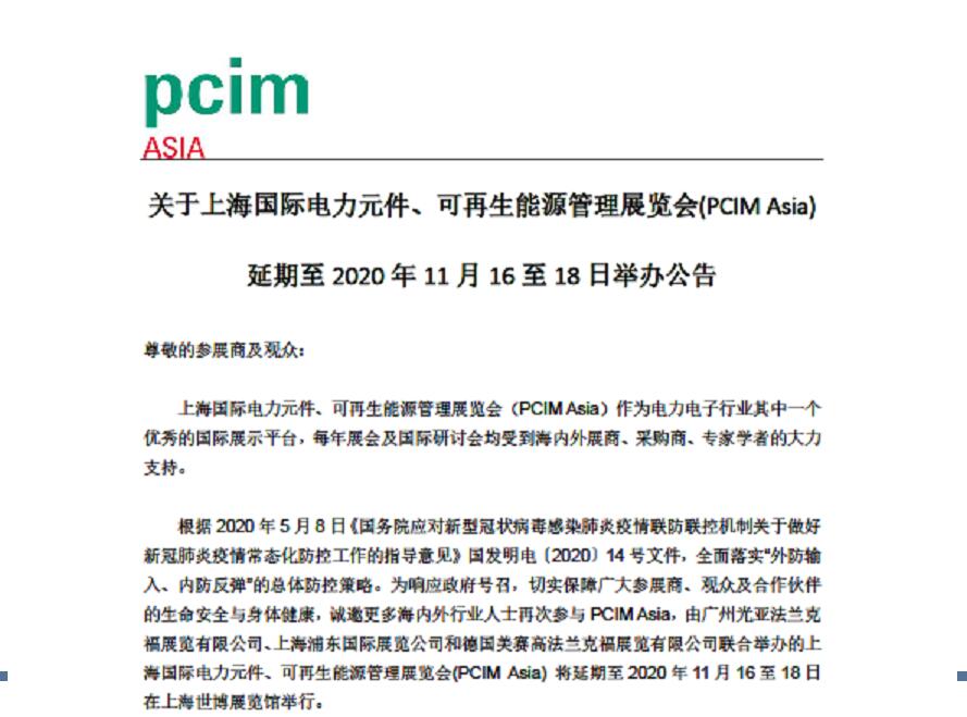 PCIM Asia 2020延期至11月舉辦