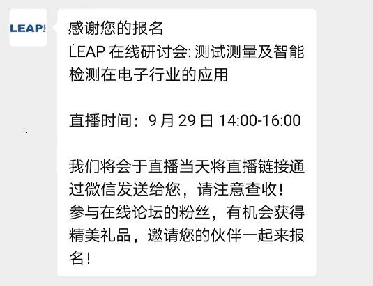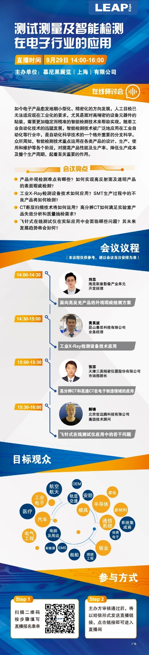 為了對測試測量及智能檢測技術進行更加深度的剖析和探討,LEAP將于9月29日14:00-16:00以“測試測量及智能檢測在電子行業的應用”為主題,舉辦在線研討會。四位行業重磅嘉賓將親臨直播間,分享其專業的判斷與獨到的見解。