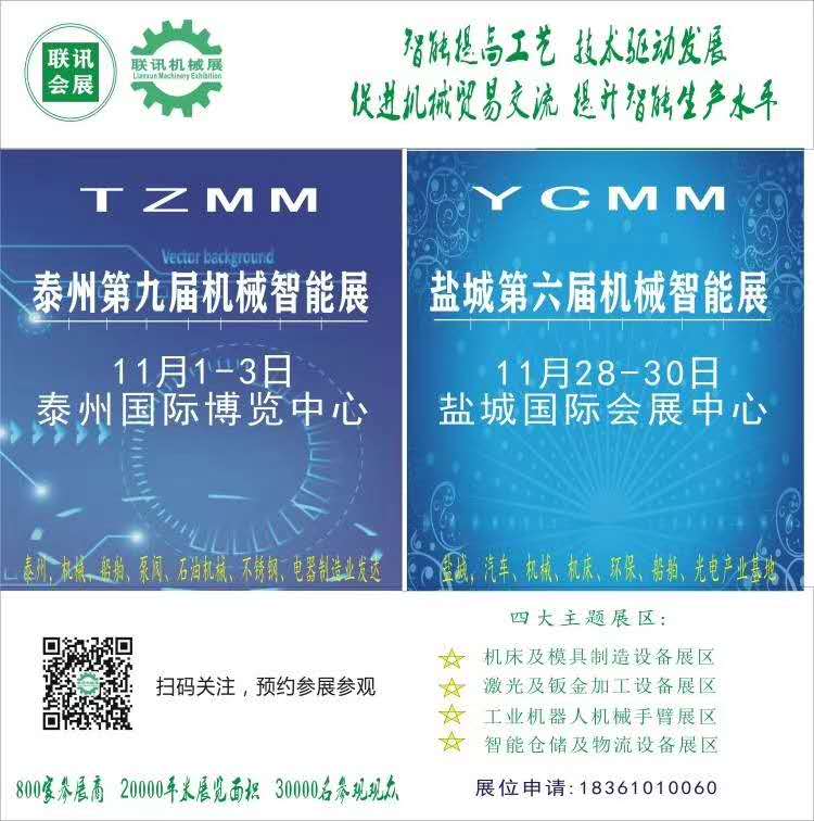 “2020中國泰州第九屆國際機械與智能制造展覽會“將于2020年11月1-3日在泰州國際博覽中心盛大舉行!作為2020下半年蘇中蘇北地區唯一大型機械行業展會,是您開發高速發展的蘇中市場首選展會平臺。我們2019年的機械展有約350 名參展商,800個展位和25000名采購商,吸引了包括美國哈斯,美國哈挺,美國辛辛那提,韓國斗山,日本發那科,日本津上,臺灣協鴻,海天精工,南通科技,力星激光,嘉泰激光,漢鋒自動化,大華激光,捷豹空壓機等眾多知名品牌。在我們的不懈努力下,2020年的展會預計有約400家參展商,1000個展位和近30000名的采購商,是您不容錯過的工業盛宴!