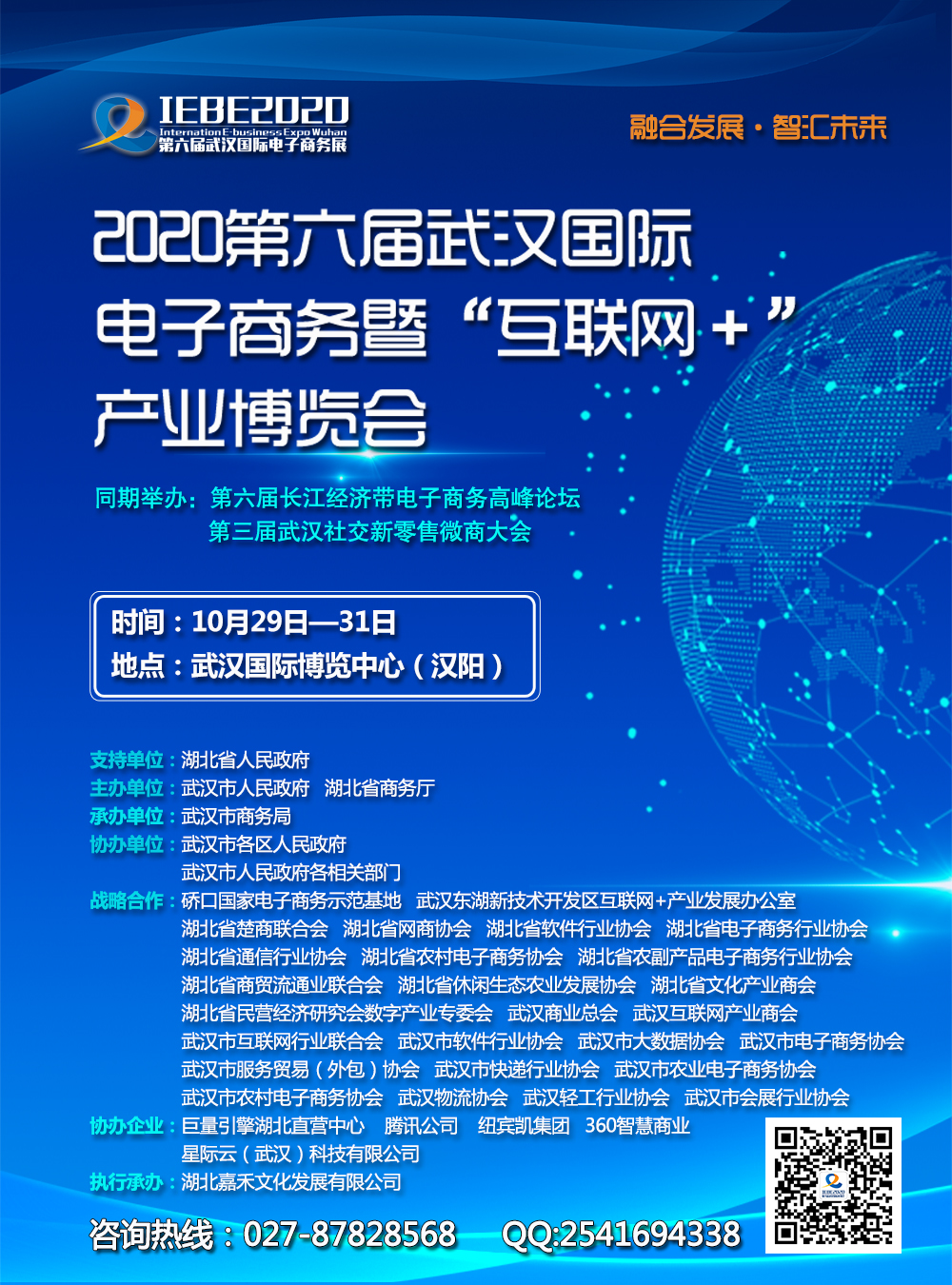 10月29日—31日,由湖北省人民政府支持,武漢市人民政府、湖北省商務廳聯合主辦,武漢市商務局承辦的2020第六屆武漢國際電子商務暨“互聯網+”產業博覽會(以下簡稱武漢電博會)將在武漢國際博覽中心隆重舉行。