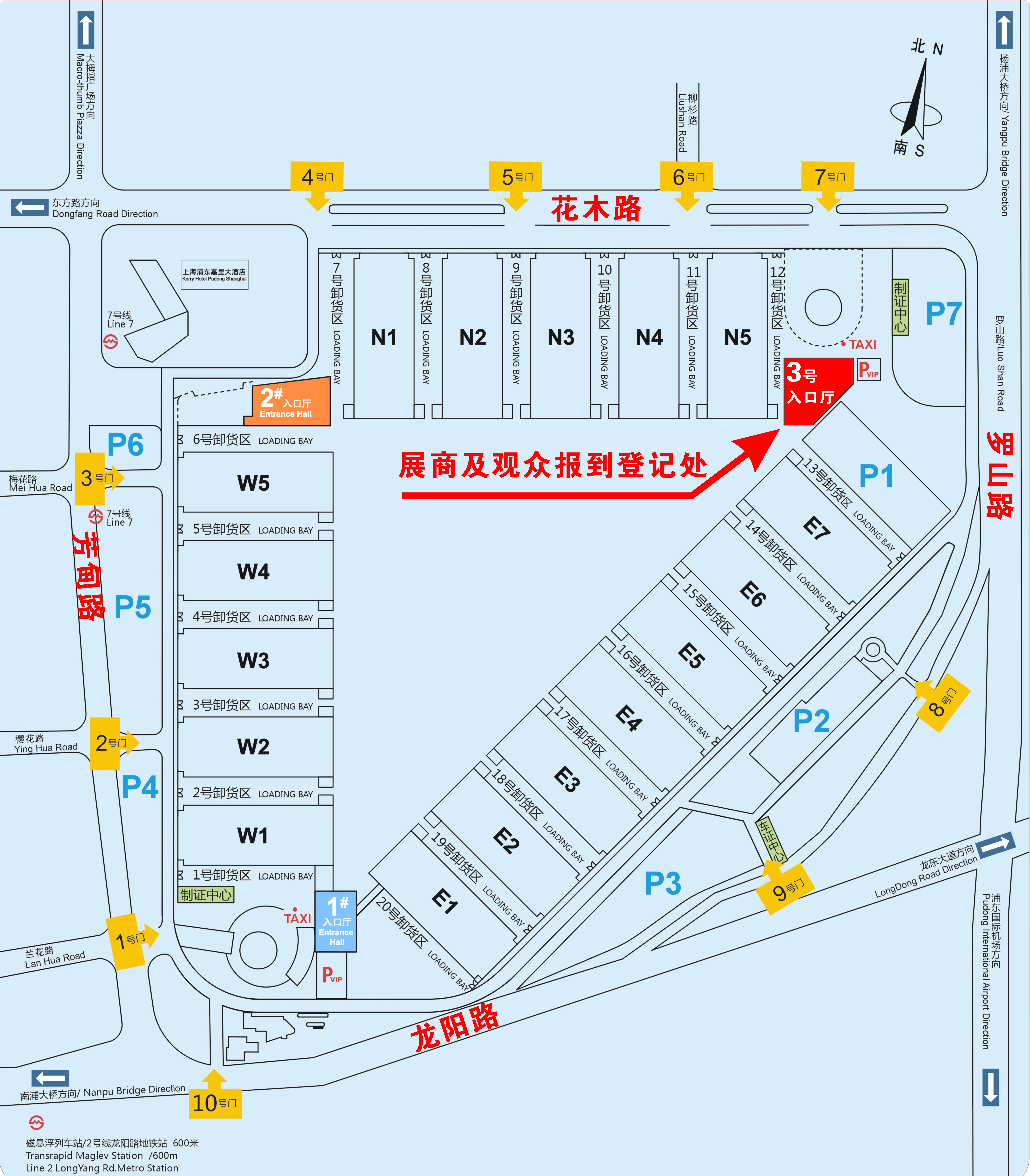 2、乘坐軌道交通2號線至龍陽路站換乘軌道交通7號線到花木路站,步行至3號入口廳;或者您乘地鐵2號線至龍陽路站,由4號口出站步行,均可直達展館。