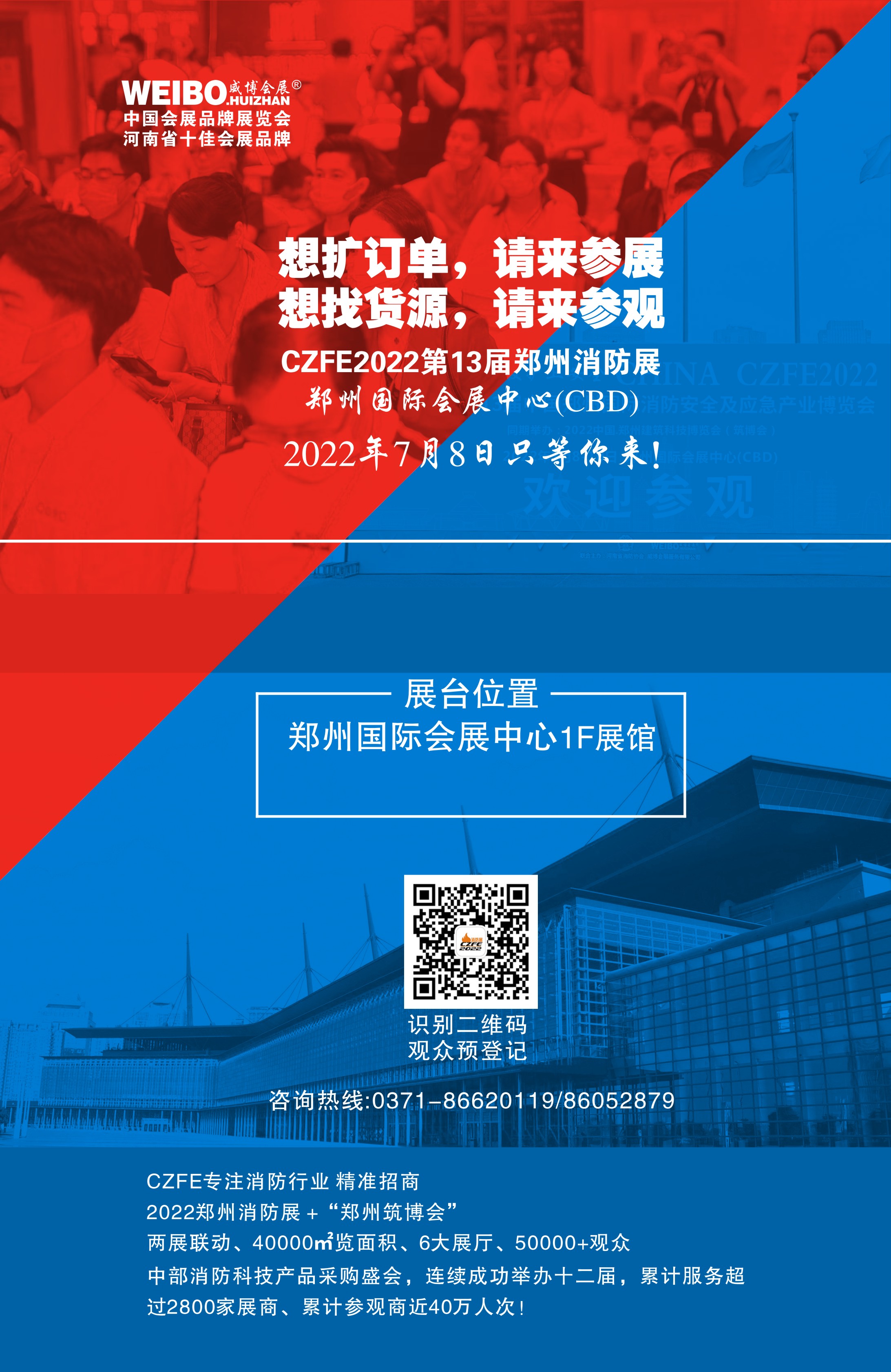 2022年7月8-10日,在鄭州國際會展中心(CBD)由威博會展旗下舉辦的“2022中國.鄭州消防安全與應急產業博覽會& 2022中國.鄭州建筑防火與耐火/阻燃材料展(CZFE鄭州消防展)”將與“2022中國.鄭州裝配式建筑與建筑科技產品博覽會(筑博會)”聯袂舉辦。