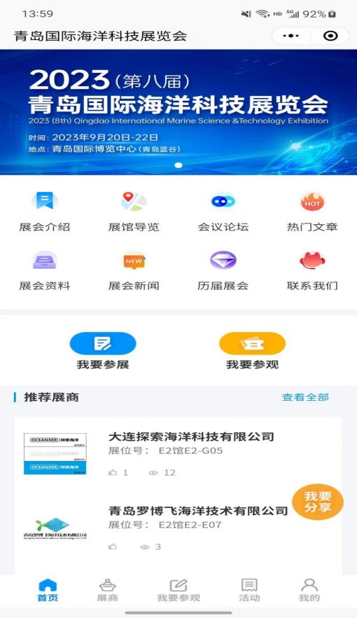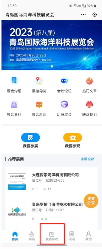 點擊展商秀底邊欄中央的【我要參會】按鈕,直接報名參加青島海科展,避免現(xiàn)場登記注冊麻煩。提前預登記的觀眾還可以享有免費午餐等展會特權(quán)!