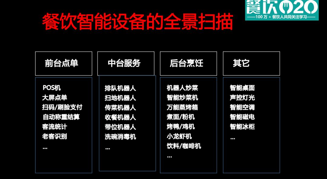 《2023年餐飲設備智能化發(fā)展報告》對餐飲業(yè)的智能設備進行了全景掃描,根據(jù)流程環(huán)節(jié)分為四大類:前臺點單、中臺服務、后臺烹飪、其它。餐飲如何做設備智能化?關鍵就是:前臺極致個性化,后臺極致效率化。