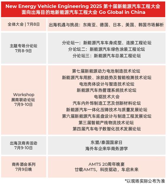 NEV Engineering 2025 第十屆新能源汽車工程大會全新出發,打造:面向出海目的地的新能源汽車工程大會,結合主辦方勵展全球化汽車產業合作資源,預計將吸引4,000名中國及1,000名來自東南亞、日本、韓國、德國、美國、印度及其他海外目的地車企、產業協會園區政府機構等領域的行業精英,共同探討新能源汽車車身,綠色涂裝、總裝、三電工程及零部件制造工程領域的前沿技術、市場趨勢、以及出海目的地的政策法規及合作機遇,為行業精英提供一個不出國門即可深度參與的國際交流盛會。