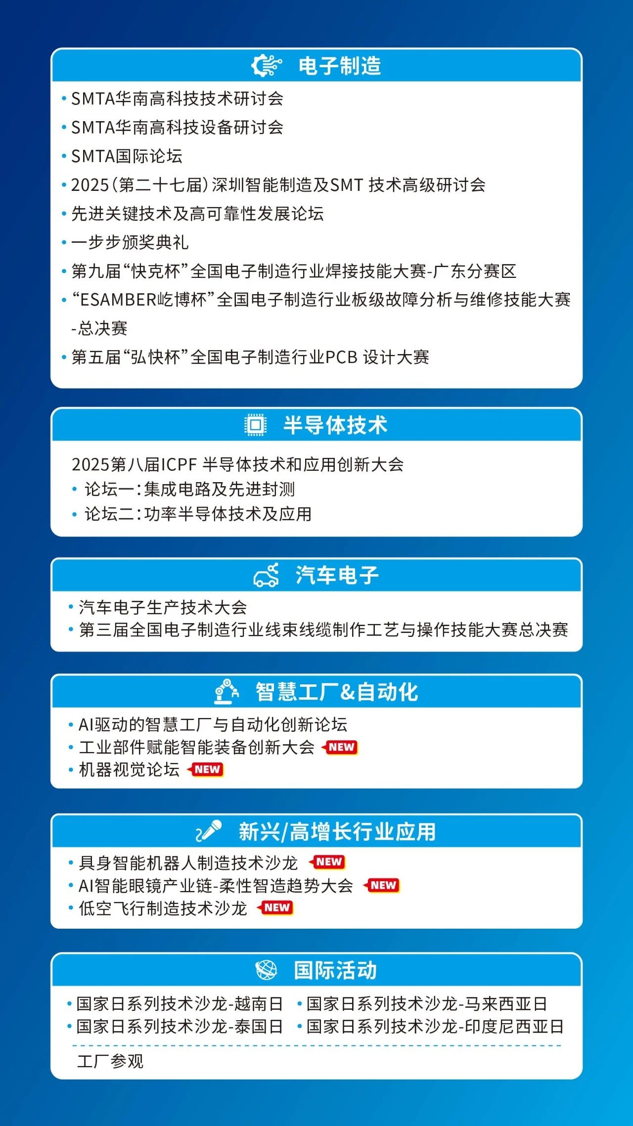 在AI終端、圖像傳感、半導體芯片等關鍵領域持續(xù)領跑,成功實現(xiàn)技術創(chuàng)新與多場景應用的深度融合。NEPCON ASIA 2025針對具身智能機器人、低空飛行、智能工廠、機器視覺、半導體、電子制造等領域開展40場會議論壇及賽事活動,深度整合國內外行業(yè)協(xié)會組織、專家、科研人員、資深從業(yè)者、行業(yè)應用終端及行業(yè)媒體等資源,探討電子制造現(xiàn)狀與未來發(fā)展趨勢,實現(xiàn)業(yè)務的持續(xù)增長,共同拓展市場新未來!